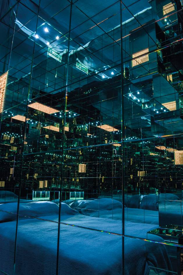Seulement scindés par trois couleurs primaires qui permettent de matérialiser les perspectives, les mille reflets du plafond aux murs vous mettent face à votre propre image répétée des centaines de fois. Rassurez-vous, la profusion retire le côté narcissique de la chose pour mieux plonger dans l’abîme du vrai ! D’autant plus que la chambre est totalement isolée du bruit extérieur… Face à votre propre respiration, une création du musicien Nicolas Godin. Le fondateur du groupe Air a conçu un morceau en constante évolution qui participe à l’interrogation de l’habitant sur sa place dans l’espace et l’architecture. De l’art de vivre, en solo ou duo, une oeuvre in situ.