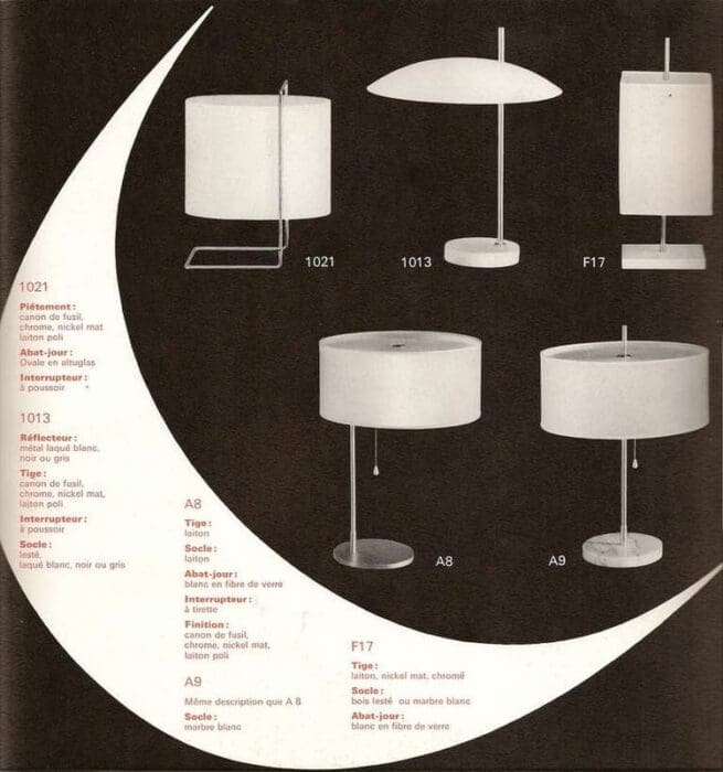 Mais Pierre Disderot continue de développer ses propres modèles, dont la lampe à poser 1013, dessinée en 1955, composée d’une tige en laiton coiffée d’une coupole en aluminium laquée pour diffuser la lumière sur la surface de travail. Ce petit bijou technique tout en sobriété sera décliné la même année en applique, percée ou non, et vingt ans plus tard, en lampadaire halogène so eighties.