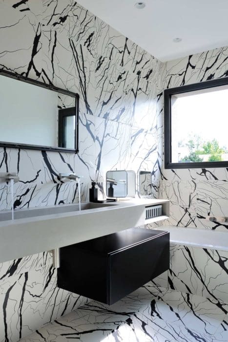 Dans la salle de bains, carrelage « Artwork Marble » de Davide Tonelli pour Ornamenta, miroir triptyque et accessoires Design et Bain Lyon. Page de gauche, dressing en sycomore laqué noir, moquette « Palmador » by Dimore Studio (Pierre Frey). Tabouret « Dam» en céramique de Christophe Delcourt pour Collection Particulière. Le tout chez Claude Cartier Décoration.