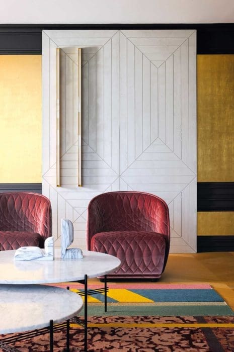 Panbéton (Concrete LCDA), décor mural à la feuille d’or by Roseyma Marion, tapis « Paralleli » by Dimore Studio (Golran), fauteuils « Redondo » de Patricia Urquiola (Moroso), table « TS » by Gamfratesi (Gubi). Serre-livre « Slo » de Christophe Delcourt pour Collection Particulière, appliques « Blade » (Baxter). Page de droite, en haut, chaises « Bodystuhl » de Nigel Coates (Gebrüder Thonet Vienna), tapis « Bliss » de Mae Engelgeer (CC tapis). En bas, dans le salon, canapé « Massas » de Patricia Urquiola (Moroso), fauteuil gris « Big Mama » de Massimo Iosa Ghini (Moroso), tissu « Lady Hamilton » (Rubelli), lustre « 05 » by Marie- Lise Féry (Magic Circus). Version en édition limitée du vase « Showtime » de Jaime Hayon et vases roses by Dimore Studio (Bitossi). Le tout chez Claude Cartier Décoration.