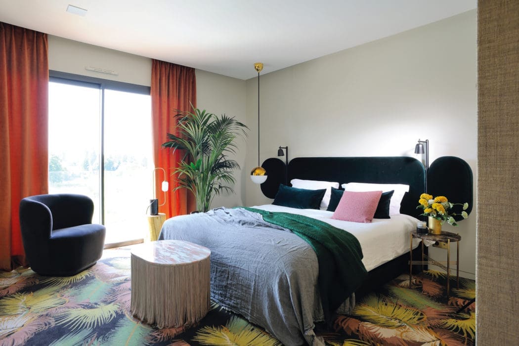 Dans la chambre, lit « Wings » by Jaime Hayon (Wittmann), suspension « 01 » de Marie-Lise Féry (Magic Circus), fauteuil « Stay Lounge » by Space Copenhagen (Gubi), table « Tripolino » de Cristina Celestino pour Spazio Spontaccio, mini table « TS » by Gamfratesi (Gubi) avec lampe « Segment » de Dan Yeffet (Collection Particulière), linge Maison de Vacances, plaid de Raf Simons (Kvadrat), moquette « Palmador » by Dimore Studio pour Pierre Frey, rideaux « Opera » en velours terracotta (Pierre Frey).