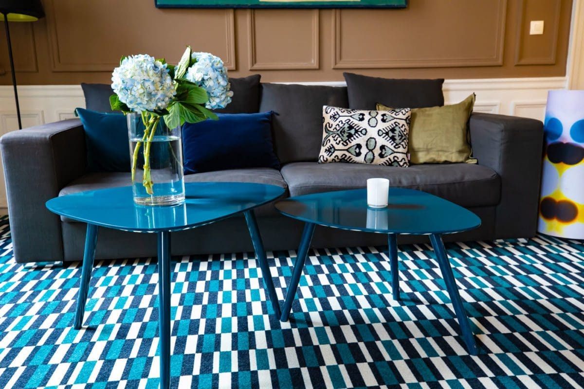 Redécouvrez le fameux « Bleu Sarah » dans une déclinaison unique où les formes géométriques sont au rendez-vous. Une autre déclinaison, issue de cette collaboration, propose une moquette aux formes plus arrondies.