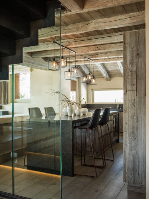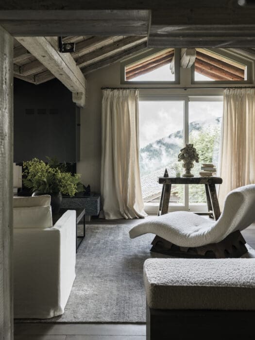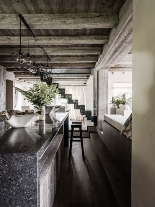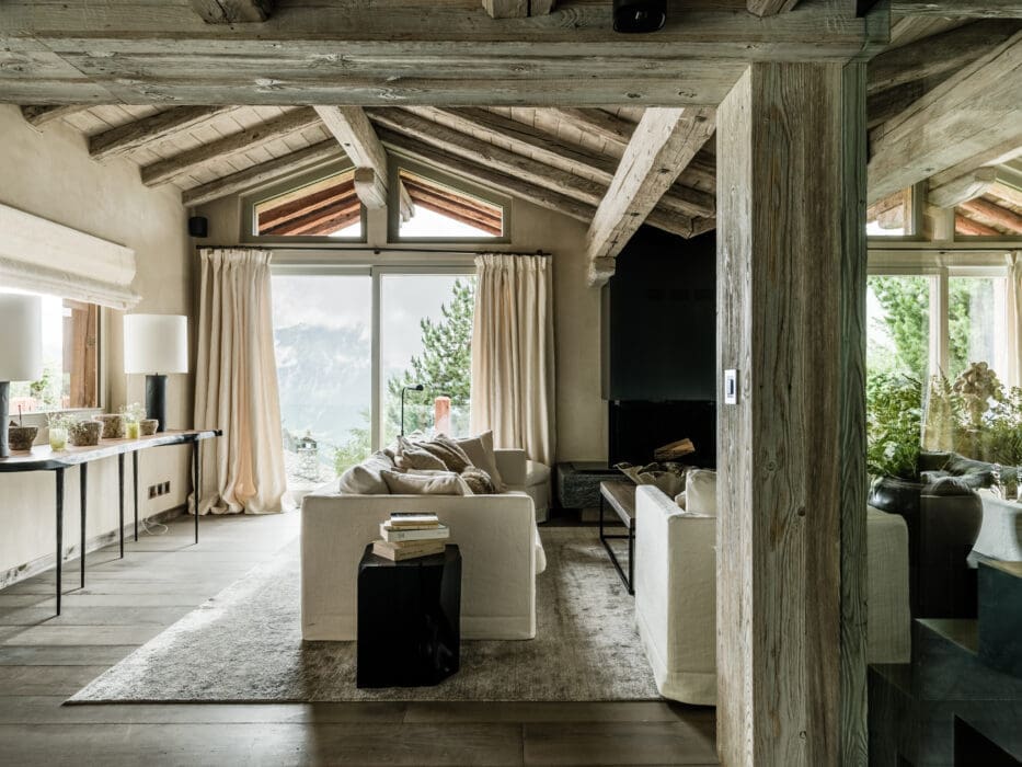 Le chalet familial, soixante ans après sa construction, mérite une remise aux normes et une rénovation, d’autant que ses nouveaux occupants, habitués aux cieux lumineux d’Asie, aux intérieurs design, clairs, au style de vie ouvert sur l’extérieur de Singapour, le trouvent sombre, étriqué, peu confortable. « Leurs souhaits, exprimés sans détour, raconte Marianne Tiegen : agrandir les fenêtres, sans nuire à l’esthétique, pour bénéficier au maximum du panorama, créer un bel et confortable espace de vie et surtout, surtout, éclairer l’ensemble. » Le brief posé, carte blanche est donnée à la décoratrice. Place au travail en relation étroite avec les artisans du coin et ceux de l’atelier de Marianne Tiegen Interiors en Belgique. « Mon fil rouge : amener un maximum de clarté, de modernité en associant les matières brutes, pierre, bois de récupération glané chez les démolisseurs de granges, trouver des astuces tout en conservant les éléments d’origine, comme les très belles poutres, qui ont été éclaircies au lait de chaux plutôt qu’à la peinture pour mettre en valeur leur style, leur texture. La toiture a été refaite en ardoises traditionnelles, et assortie d’une bonne isolation, pour protéger efficacement le chalet des températures très souvent négatives en hiver… »