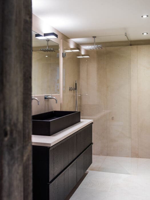 VERSION JUNIOR. Coin salle d’eau attenant à une chambre d’amis, aménagé avec douche et double vasque. Pierres et sol en travertin nude, robinetterie Vola, céramique Agape Design.