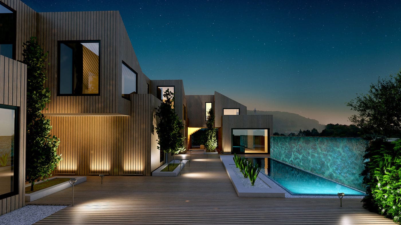 Les études de la villa «3friends» étaient basées sur le défi particulier du projet. Trois vieux amis voulaient faire construire trois villas sur des propriétés adjacentes qu’ils avaient achetées plus tôt. Ils voulaient que leurs villas aient des espaces communs de rassemblement et de fête ainsi que des espaces privés séparés pour chaque villa.