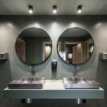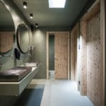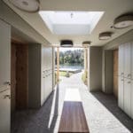 Dans le centre, il y a un petit atrium ouvert avec des vestiaires pour les invités et des casiers spécialement conçus par les entreprises artisanales locales. L’atrium offre une vue panoramique sur l’horizon. Pour se fondre dans l’environnement naturel, les architectes se sont concentrés sur des couleurs et des matériaux naturels. Le vert a été choisi comme couleur de base pour le sol, les murs et le plafond, avec différentes nuances pour créer une ambiance naturelle.