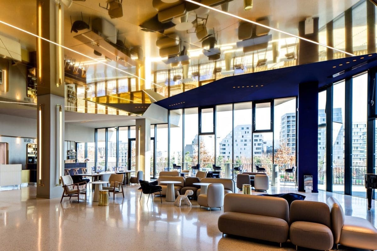 7 salles, 1163 fauteuils, 3500 m² d’espaces sur 3 niveaux, le cinéma Batignolles par Ana Moussinet a été conçu à la manière d’un lobby d’hôtel.