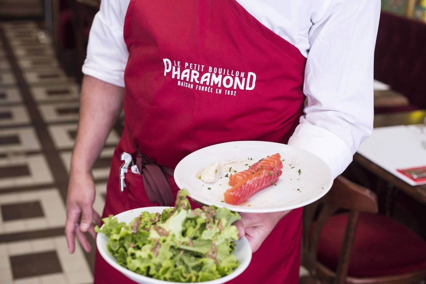 Aujourd’hui, le Pharamond devient Le Petit Bouillon Pharamond. Avec sa carte bistrotière accessible et composée de plats traditionnels et réconfortants, on retrouve les joies simples de la table. Bien entendu, l’institution a conservé ses spécialités normandes comme le camembert rôti au miel ou le foie gras maison au Calvados, suivis des légendaires tripes à la mode de Caen, renommées « le bouillon Pharamond à la mode de Caen », avant un petit trou normand pour finir le voyage sur un riz au lait façon Teurgoule et pommes caramélisées…