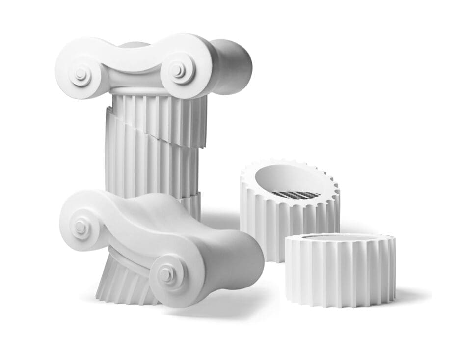 Les designers de Studio 65 ont imaginé « Capitello », une colonne tronquée inspirée de l’Acropole dont le chapiteau, tombé par terre, forme un fauteuil. L’ensemble a été développé dans une mousse de polyuréthane. Un mariage de forme antique et de matériau contemporain toujours édité aujourd’hui…
