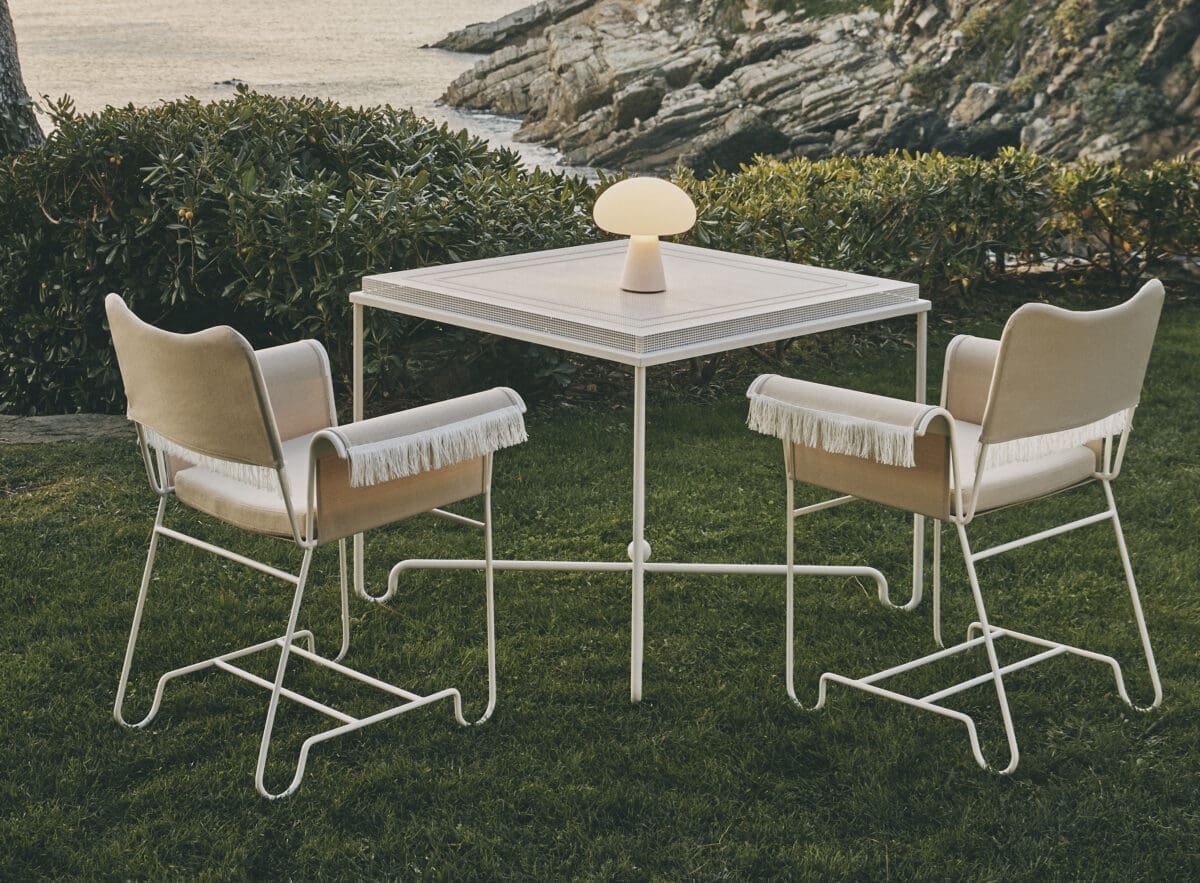 Très prolifique, Matégot dessine, conçoit et produit vite et bien : le métal remplit toutes les fonctions : peu cher, il se plie, se soude et se perce tout en étant robuste. L’utilisation d’une tôle microperforée pliée en éventail – on appellera cela du Rigitulle, ou dentelle de métal – et d’une tôle ajourée de carrés apportera de la légèreté à son mobilier. Pour l’ensemble de plein air « Tropique », le plateau perforé de carrés de la table crée un jeu de transparence bienvenu, esthétique et pratique ; il évite que l’eau de pluie stagne en surface.