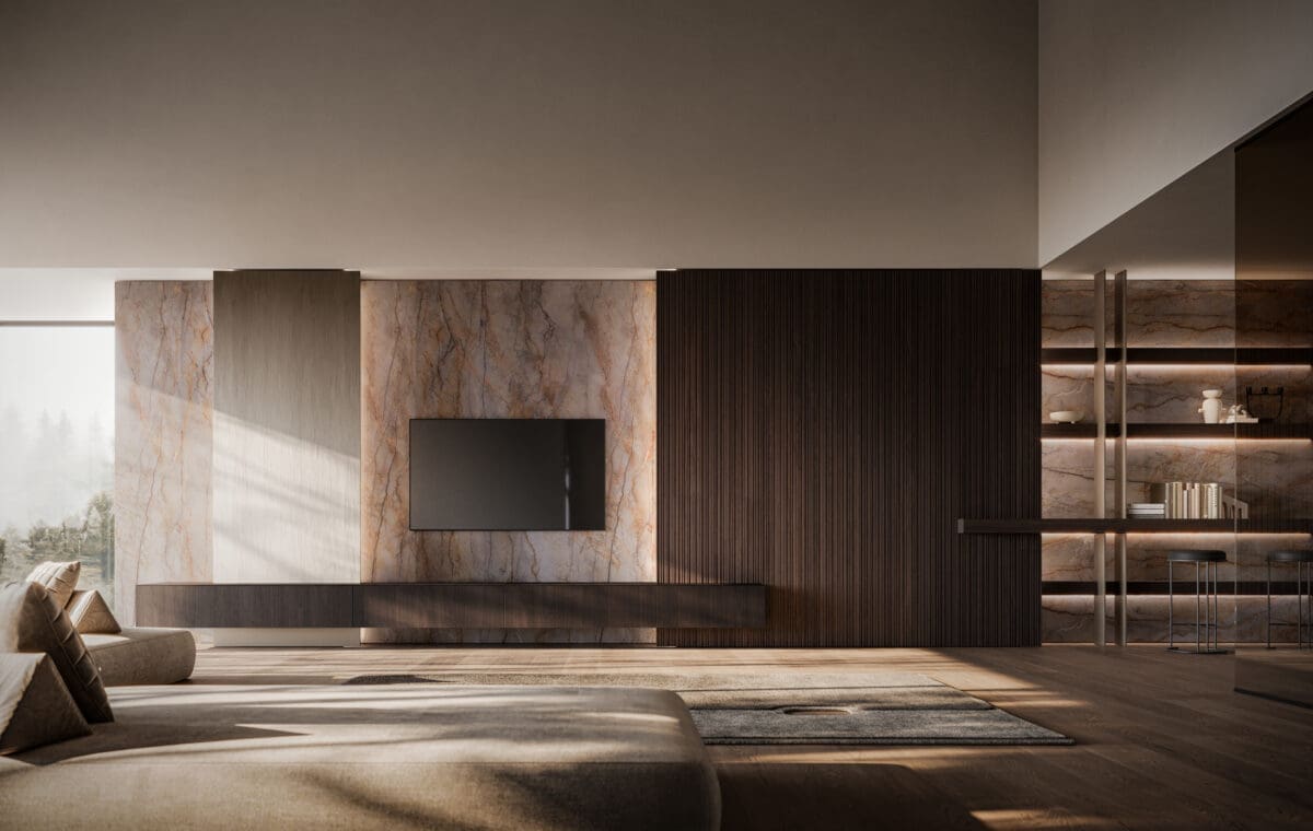 Association de matériaux racés, tons neutres, rétroéclairage des accessoires… Le nouveau programme personnalisable « Blade/Groove » Modulnova permet de profiter d’une solution de rangement fonctionnelle et sophistiquée au salon. Conçu pour s’adapter à l’espace disponible, il comprend des modules suspendus fermés, une bibliothèque fusionnant avec raffinement montants verticaux en métal et tablettes en chêne, ainsi qu’une colonne « Cocktail » équipée d’étagères porte-verres et d’un espace pour cave à vin… Une solution parfaite pour les épicuriens férus d’esthétique léchée.