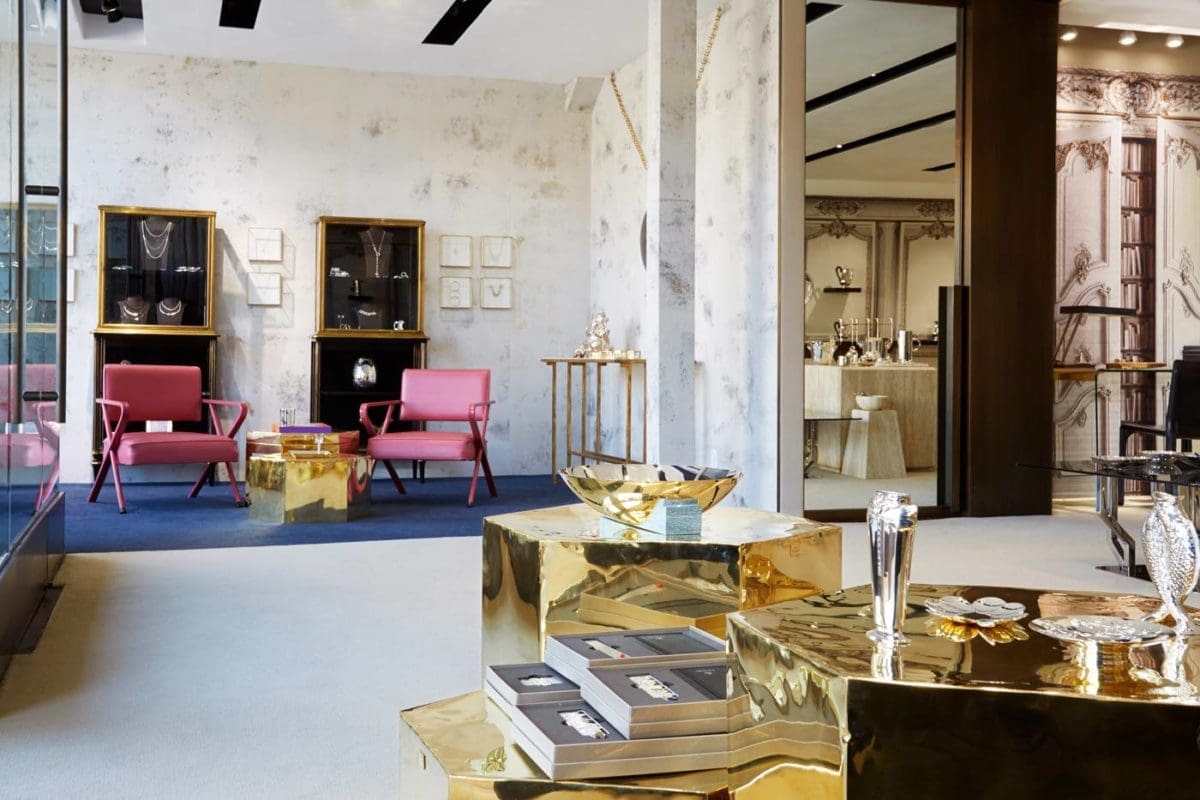 À chaque partie son univers. La première est dédiée aux bijoux et révèle un papier peint or et argent. Des trompe-l’œil sur panneaux sont à découvrir dans la partie art de vivre. Ils expriment la quintessence d’un appartement parisien haussmannien. Enfin, les flamants roses, symboles du Los Angeles des années 50, sont à l’honneur au cœur de la boutique, grâce aux fauteuils qui euphorisent l’ensemble. Le studio énonce toute sa créativité et son savoir-faire d’élite, dans un décor unique, en mêlant le chic du 18e à la Française et l’esprit décalé de Christofle.