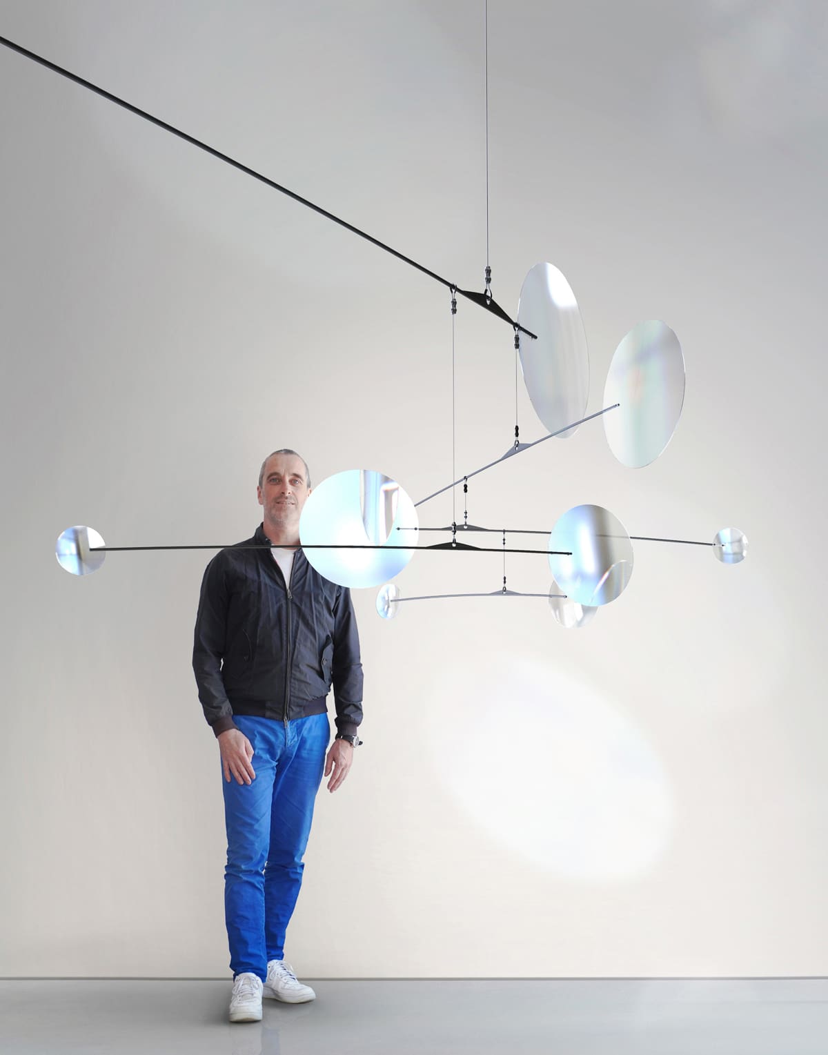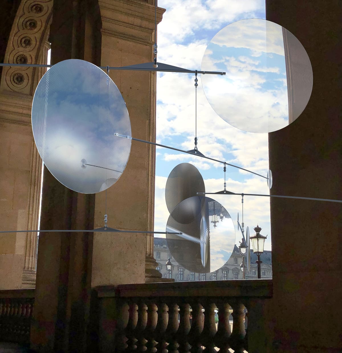 Pendant le confinement, Vincent Leroy a testé ses verres mobiles dans le ciel ensoleillé de Paris. C’est une incroyable revisite du mobile mais avec des lentilles de Fresnel: un moyen poétique de filtrer la réalité. Les toits parisiens semblent être vus à travers un rêve. Testé d’abord en atelier et ensuite en galerie, l’effet est spectaculaire. C’est l’ajout de l’effet du mobile et de la magie des verres. C’est un effet de terrain de jeu optique, une expérience incroyable. Les lentilles en liberté flottent au vent et créent une vision plus légère et rêveuse de notre environnement. Les lentilles de Fresnel ajoutent un effet optique captivant. Encore une fois, c’est le subtil mélange de poésie et de basse technologie qui nous détache ici du monde réel. Cela ressemble à un jeu intrigant, léger, fluide, presque volatil. Tout semble respirer: pas de début, pas de fin, juste un ruisseau.