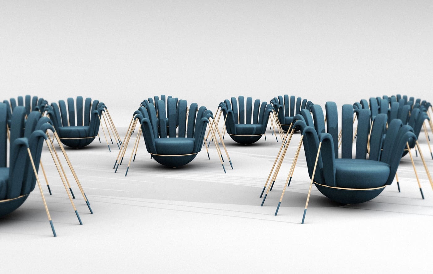 Aussi bien à l’intérieur qu’à l’extérieur, les fauteuils ont une base sphérique et sont recouverts de tissus Sunbrella, au siège circulaire sont suspendus une multitude de pieds en métal, dont les finitions peuvent être déclinées de l’or à la couleur en passant par l’argent et le cuivre.