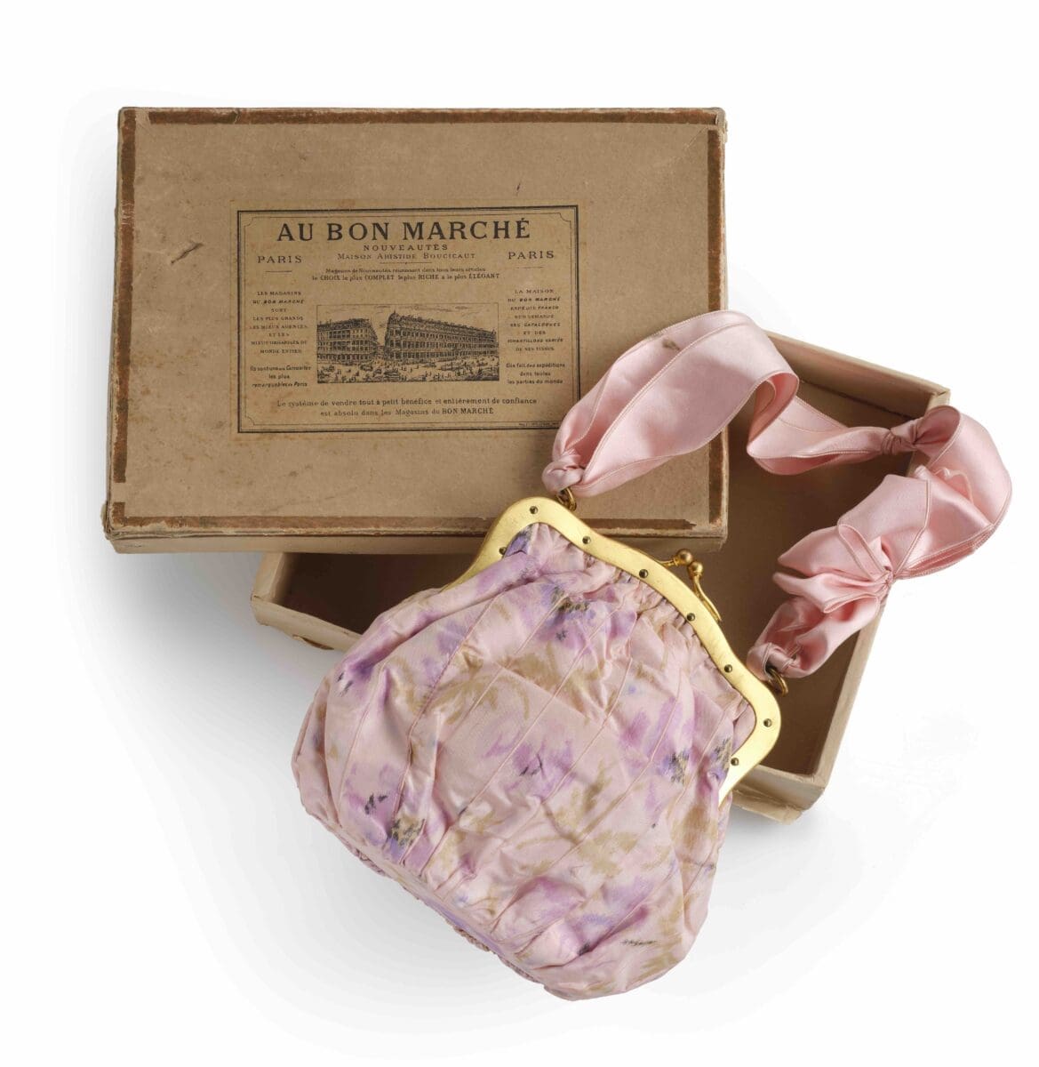 Sac à main en taffetas de soie façonné, imprimé sur chaîne, métal doré et satin de soie (1910-1919).