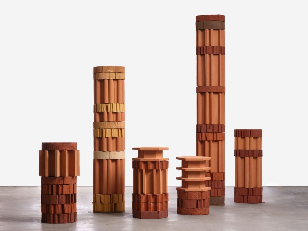 Stèles et tabourets en briques et tuiles de construction de la collection « Fragments », conçue par le designer et sculpteur Aurélien Veyrat et réalisée en autoédition. © DR