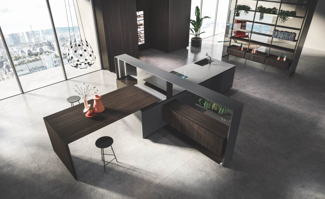 Cette cuisine mixe lieu de partage à microarchitecture fonctionnelle et « multitasking », avec ce système en pont marquant la limite entre zone de préparation et zone de convivialité. « Nautila »,prix sur demande, Arrital Cuisines.