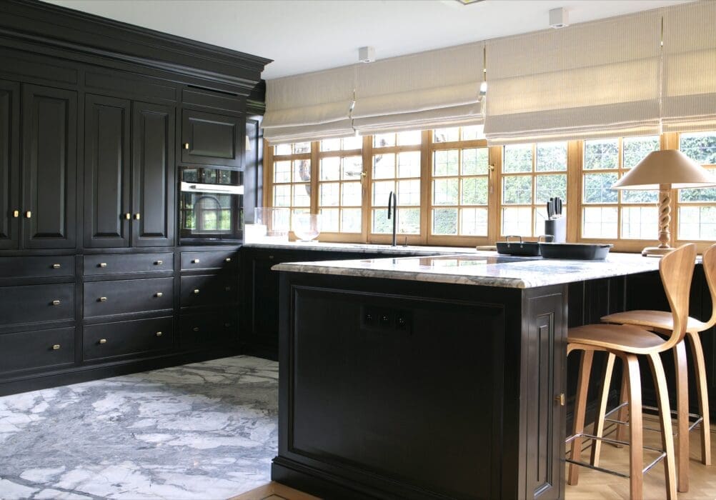 Cuisine en érable peint noir mat, intègre un tiroir culinaire ainsi que de nombreux rangements dont deux de type « pharma », plan de travail en marbre, mitigeur RVB finition noir mat. 60 000 €, Baden Baden.