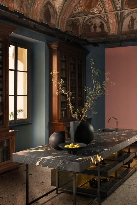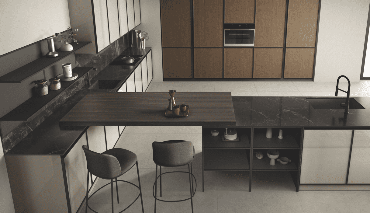 Dans cette cuisine en Silestone®XM au motif veiné sombre sur un fond blanc, l’îlot central accueille des étagères pour présenter des objets de décoration. « Collection Earthic®Raw A », prix sur demande, Cosentino Studio.