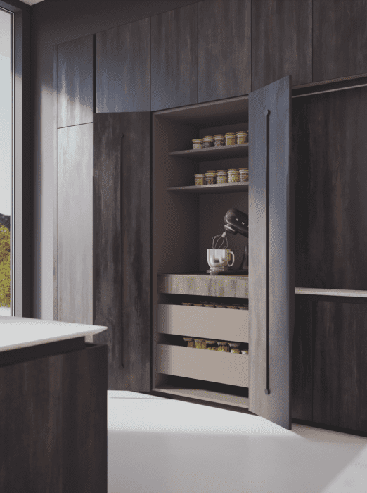 Une attention particulière est portée aux nouveaux espaces de stockage de la nourriture. Face à l’essor du mouvement « fait maison » et du retour aux sources de l’alimentation, les cuisines se dotent désormais de rangements dédiés pour entreposer en toute simplicité et avec élégance les provisions de longue durée. Ces nouveaux garde-manger, souvent intégrés discrètement dans l’agencement global, permettent de conserver une grande variété de produits secs, de bocaux, et même de légumes à l’abri de la lumière et des variations de température. Les tiroirs profonds, les étagères coulissantes et les armoires à épices sur mesure sont conçus pour optimiser l’espace disponible tout en offrant un accès facile et organisé aux ingrédients. Cette tendance répond au besoin croissant de stocker des aliments de manière pratique et accessible, tout en maintenant l’esthétique épurée de la cuisine. Ces rangements transformés en garde-manger moderne font revivre l’esprit des cuisines d’antan, où l’abondance et la préparation à long terme étaient au cœur des pratiques domestiques, tout en s’adaptant aux exigences de la vie contemporaine.