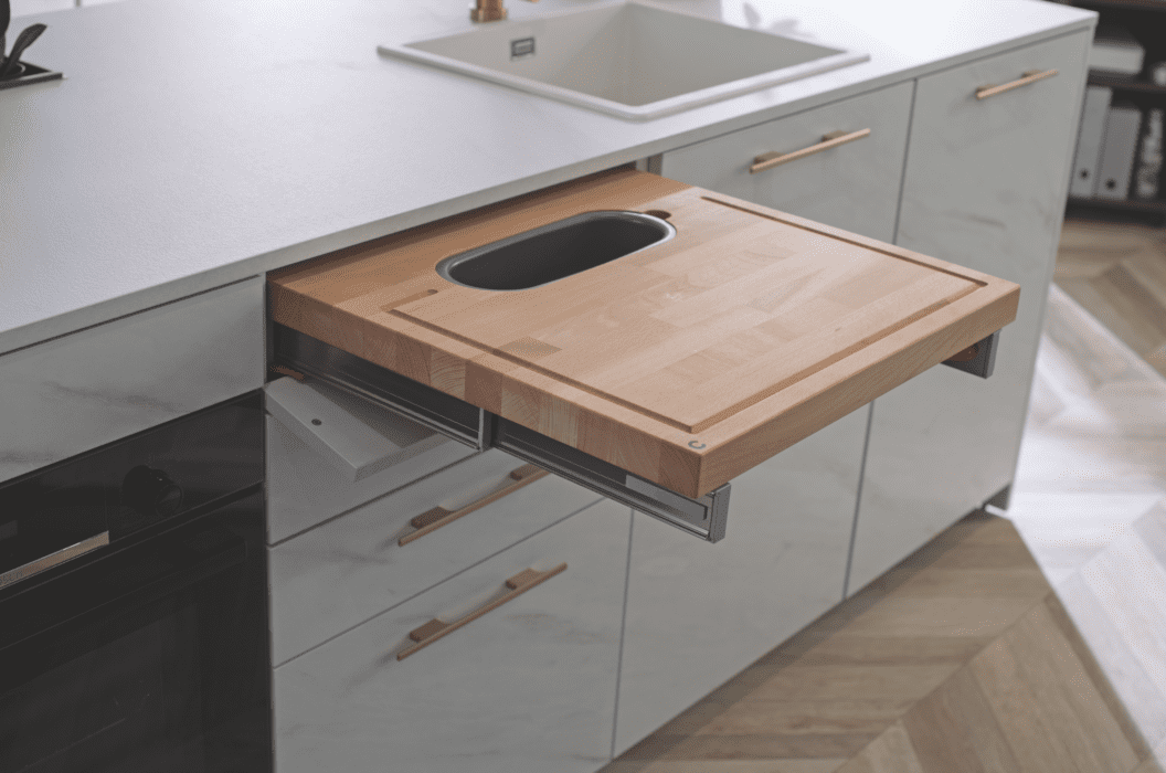 Ce billot 3-en-1 en bois massif dispose d’une grande surface plane avec rigole de récupération des jus, dédiée à la découpe des légumes ou de la viande, et d’un bac à déchets amovible à l’arrière. Prix sur demande, Cuisinella.
