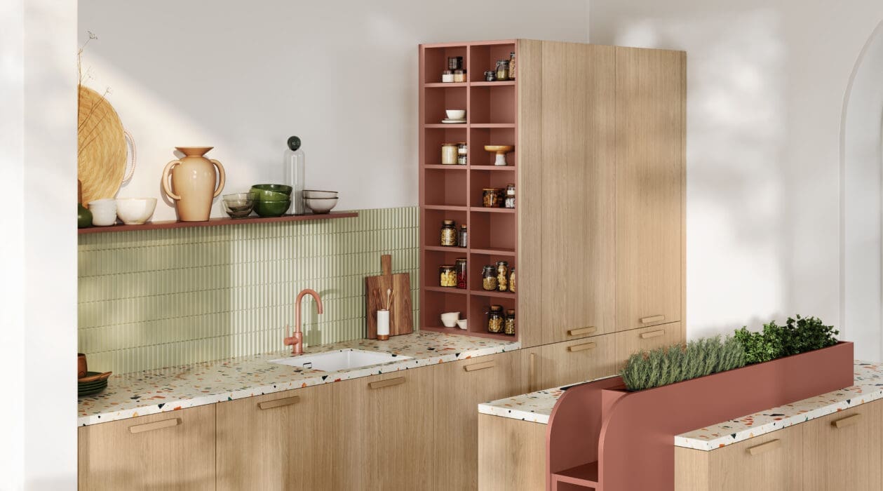 Cuisine biosourcée fabriquée en France, conçue à partir de la technologie Evertree, meilleure pour la qualité de l’air intérieur et la planète, jardinière et « bocothèque » intégrée. « Fleurs », prix sur demande, Cuisines Morel.