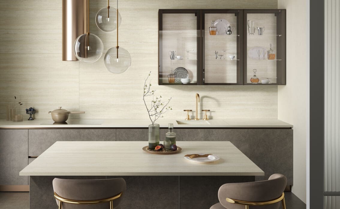 Plan de travail en Laminam coloris Travertino Bianco, effet texturé valorisant le travail de l’eau sur la pierre au fur et à mesure des années, épaisseur 12 mm. « Collection Hado », finition Rain, sur devis, Laminam.