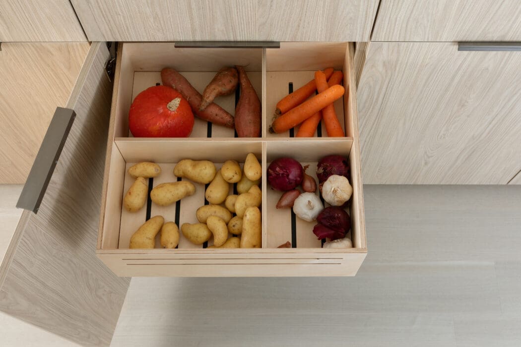Ce légumier coulissant en bouleau traité contact alimentaire s’impose comme un bon complément au réfrigérateur. Il permet un stockage facile, protège de la lumière et préserve les nutriments. « Éveil », prix sur demande, Mobalpa.