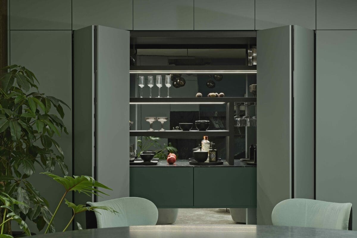 Cette cuisine minimaliste cache un élégant bar à cocktails fermé par deux portes doubles