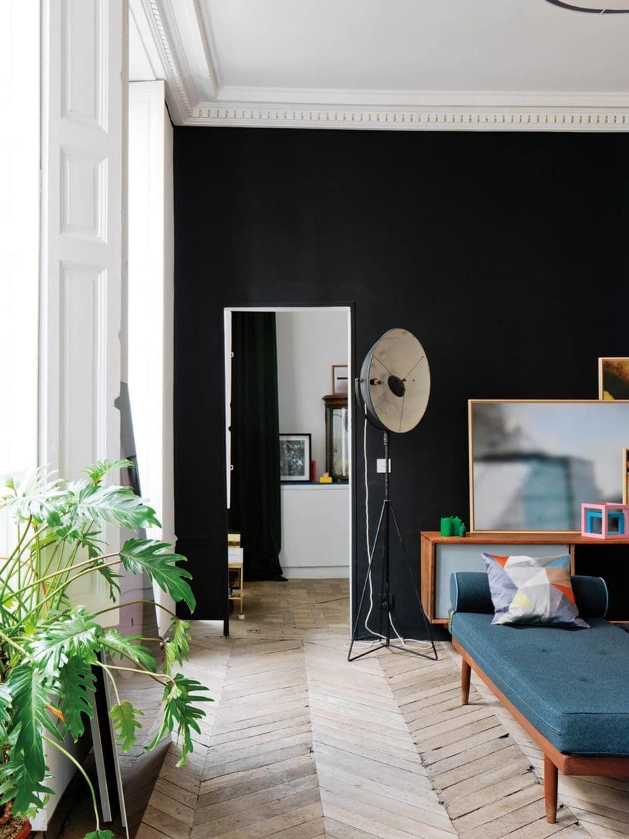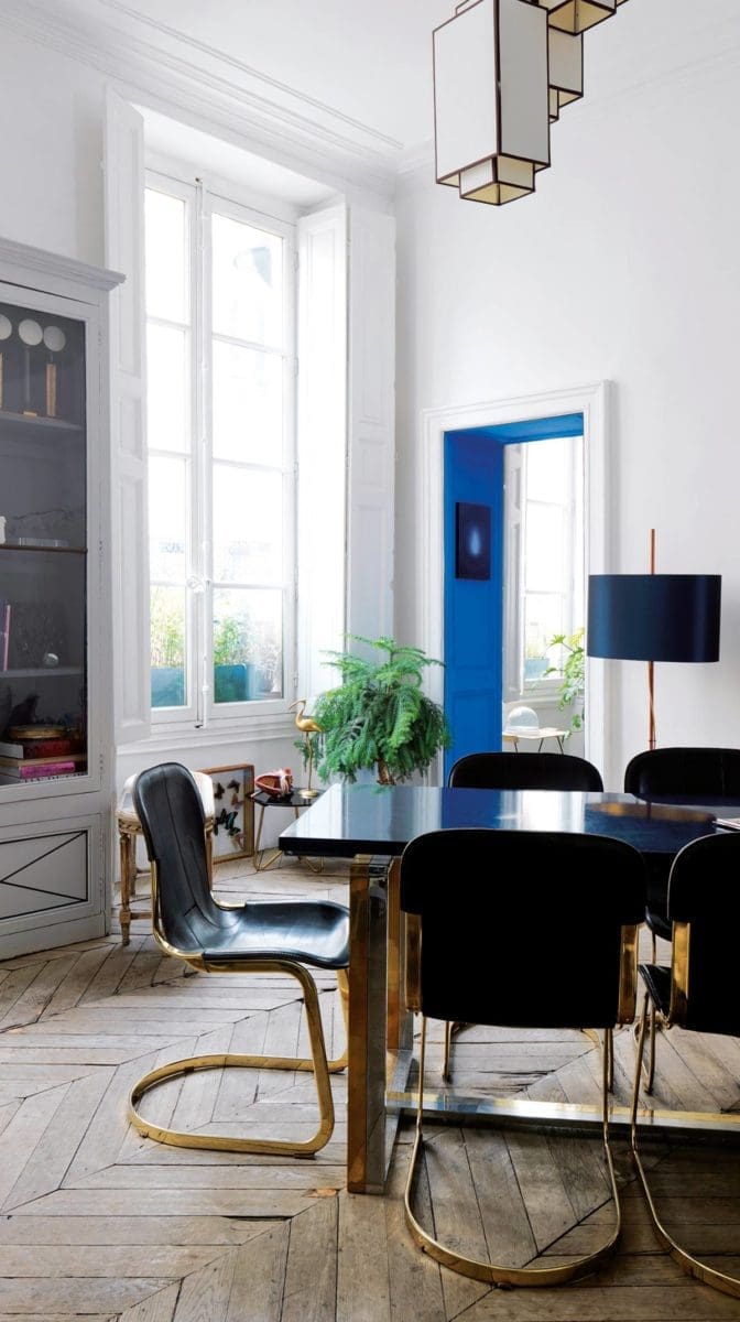 Belle hauteur sous plafond, moulures, fenêtres hautes, parquets anciens… Nul doute, le lieu fédère tous les critères d’un bel appartement parisien. Et porte des traces d’un ancien couvent du XVIe siècle, car les transformations que son propriétaire lui a fait subir l’ont débarrassé de ses pesanteurs d’autrefois. Résultat : une succession de pièces habitées qui lui ressemblent et jouent sur la juxtaposition d’objets parfois hétéroclites, sur des parti-pris chromatiques, des meubles bas pour augmenter visuellement les volumes et sur un hommage à la nature et aux années 50.