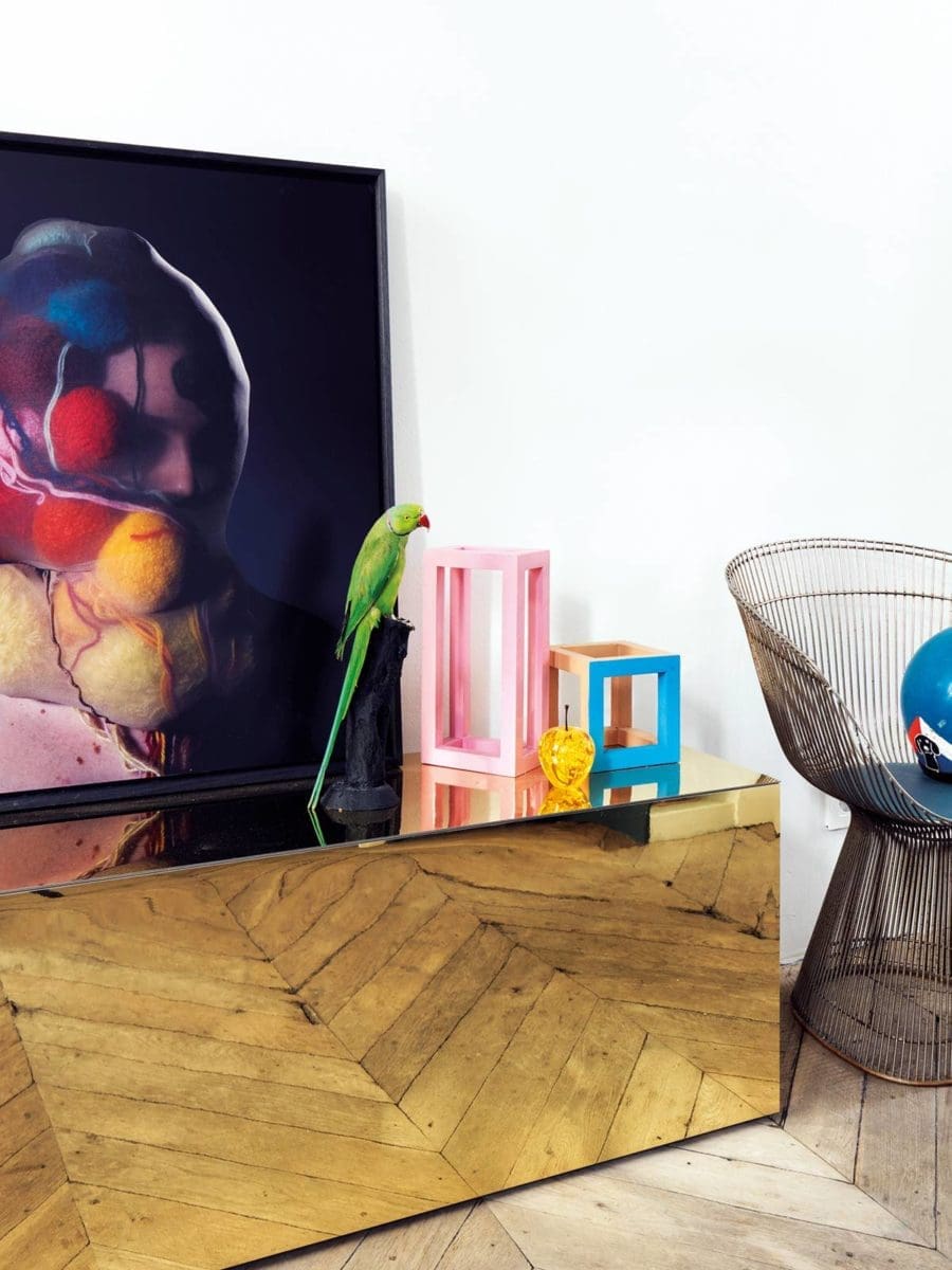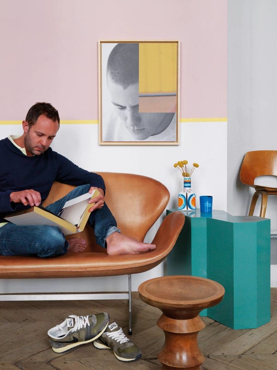 « Il s’agissait effectivement d’exploiter la structure ancienne du lieu afin de mélanger du mobilier contemporain avec des aplats de couleurs que l’on retrouve sur un mur, sur un meuble d’appoint ou encore dans l’encadrement d’une porte, explique-t-il, et de faire que l’ensemble ait un petit côté Palm Springs des années cinquante. C’est-à-dire un espace de vie qui soit léger et ludique et véhicule davantage des émotions que des messages décoratifs. Mais j’aime bien également l’idée d’en avoir fait une sorte de laboratoire qui fasse écho à mon métier, dans la mesure où la décoration change tout le temps, comme la tonalité des murs, en fonction des époques et de mes trouvailles. Un lieu d’expérimentation pour tester de nouveaux mélanges, de nouvelles émotions. »