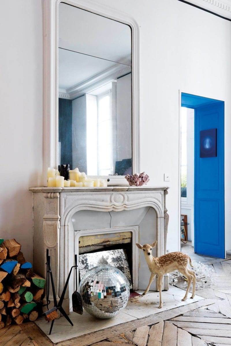 C’ est d’ailleurs plus un œil d’artiste que d’architecte d’intérieur qu’il pose sur les choses, jouant ainsi sur des vibrations optiques, sur les jeux de couleurs et de graphismes, à l’image des murs bicolores ou noirs des pièces de réception, du pan de mur vert de la cuisine, ou encore des encadrements de portes peints en bleu. D’où cet ensemble d’effets visuels qui rendent le lieu plus grand, ou plus mystérieux, qu’il ne l’est. La plupart des objets, Jean-Christophe Aumas les a trouvés au hasard de ses promenades dans des free markets, des brocantes ou encore lors de ses nombreux voyages, au Japon ou aux Etats-Unis, « des pays que j’adore pour leur culture et leur urbanité, dit-il, mais j’aime également les bords de mer, les lieux vides et calmes pour le repos. » De retour chez lui, il met en scène ses trouvailles, souvent de bric et de broc, dans des scénographies personnalisées qui enferment des histoires. La nature est partout, évoquée par touches sentimentales, rarement anecdotiques. Il adore les fleurs éternisées, les animaux naturalisés, tel ce faon qui trône près de la cheminée, ou encore ce perroquet empaillé qui se reflète sur le plateau d’un buffet en miroir. Autre douce folie dans la cuisine, des fleurs en plastique posées sur le plan de travail, un monolithe de marbre qu’il a imaginé en hommage à Sol LeWitt. Et puis des partis-pris décoratifs qui laissent l’esprit vagabonder, comme les fils métalliques des suspensions de la cuisine qui font penser aux pattes d’une araignée. Sur les étagères, reposent pêle-mêle des coraux, des statues animalières ou encore des cornes d’animaux sauvages. Cette nature, traitée de manière simple et délicate, se mêle ainsi à un mobilier d’Arne Jacobsen, à des chaises de chez Knoll et de Charlotte Perriand, à un paravent sculptural d’Eileen Gray… histoire d’établir des liens entre les époques, les émotions, les rencontres.
