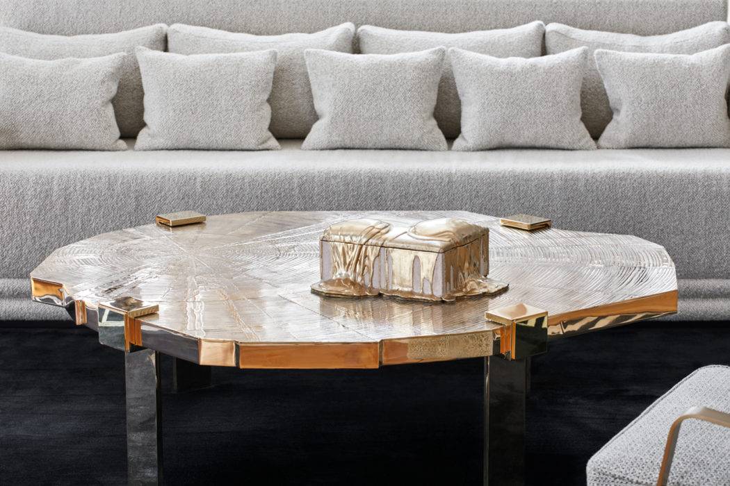 Pile dans la tendance bouclette, Stéphanie Coutas a choisi le tissu « Bridget » de Pierre Frey pour habiller de douceur le canapé du grand salon. Ici aussi, le doré est à l’honneur avec la table « Bronze Cambium » Stéphanie Coutas Design et la boîte « Moon Gold Box », une œuvre de Nancy Lorenz.