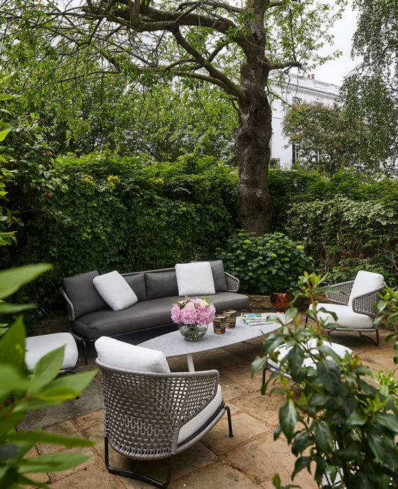 En été, cette courette constitue un écrin de verdure et d’intimité pour toute la famille. Sièges et coussins « Cord » de la collection Aston et table ovale « Sullivan » en pierre Béola argentée, le tout Minotti ; bougies « Trano » Baobab Collection ; table ronde « Time Piece » en céramique et cuivre, Sé Collections.