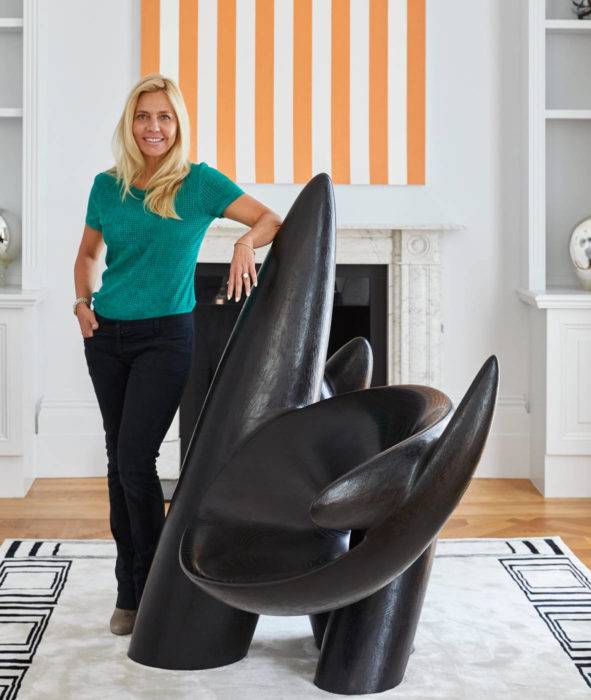Experte en art, la décoratrice Stéphanie Coutas pose près de la sculpture « Out of the woods 217 » de Wendell Castle, décédé récemment. Au mur, toile de Daniel Buren, 1970. Au sol, tapis Stéphanie Coutas Design pour J.D. Staron.