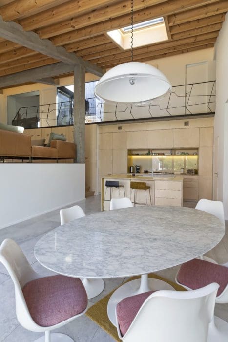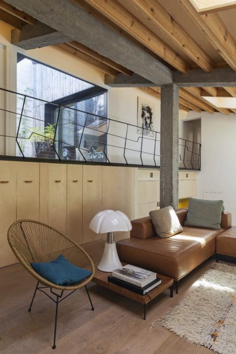 Premières idées : s’appuyer sur les trois dénivelés existants pour créer trois étages ; conserver les poutres en béton d’origine, sorte de lien entre le passé et le présent ; bien isoler la façade principale des façades mitoyennes ; et surtout, puiser un maximum de lumière naturelle pour la redistribuer avec générosité dans toute la partie ne bénéficiant d’aucune ouverture.