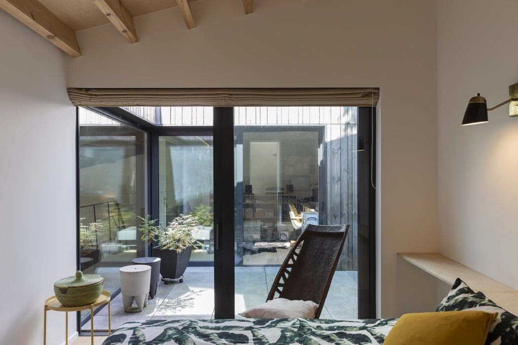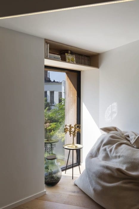 Elle est designer textile, il est passionné de musique ; tous deux aiment les lieux et les quartiers atypiques. Ce couple très artiste, parents de trois enfants, cherchait à s’installer dans un quartier bruxellois qui bouge. C’est le cas de Forest : entre la place Albert et le Forest National, salle de concert, ça swingue, avec en prime la végétation du parc alentour, les belles maisons Art déco qui s’alignent non loin des usines, dont celle de Volkswagen, des ateliers d’artisans et des entrepôts. La famille a trouvé une demeure donnant sur la rue dans un secteur très urbanisé. Quelque temps après, elle a repéré derrière chez elle un grand bâtiment qui semblait abandonné, graffité, fermé, enclavé dans une zone pavillonnaire. La surface les a interpellés, ainsi que la proximité avec leur domicile. Quelques recherches, quelques démarches et le lieu, pour le coup très atypique, de 210 m2, est devenu leur. Leur intention ? Le transformer en annexe, indépendante de leur habitation principale, mais pouvant, outre des chambres supplémentaires, abriter un salon de musique pour monsieur, un studio de création pour madame, et des espaces tranquilles pour tous. Connaissant l’inclinaison du cabinet oPla Architecture pour la restauration des bâtiments les plus improbables, les nouveaux acquéreurs sont entrés en relation avec ses fondateurs. « Lorsque nous avons découvert cette grande bâtisse dotée d’une seule ouverture mais d’une vertigineuse hauteur sous plafond, raconte Pedro Monteiro de Sousa, l’un des trois associés, nous avons tout à la fois mesuré son potentiel et les contraintes : la plus grande étant de l’éclairer le plus possible, trois façades étant aveugles. Et d’imaginer que ce lieu brut avec, entre autres, sa fosse de vidange de garagiste, devienne un cocon chaleureux. »