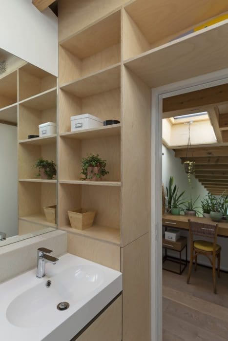 Les propriétaires, adhérant totalement à la démarche d’oPla, se sont pris au jeu et ont eux-mêmes décidé de chiner de nombreux éléments, non seulement du mobilier mais aussi des objets utilitaires, comme des lavabos. Au fur et à mesure de leurs trouvailles, les architectes ont adapté leurs plans. Une collaboration enrichissante, même si elle a parfois quelque peu ralenti le chantier.