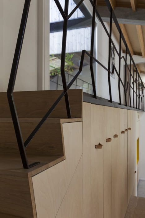 Très vite, ils dessinent les différents étages, trois donc, une passerelle aérienne et élégante reliant les niveaux ; ils créent un patio extérieur, source de lumière et – seule vraie modification des structures existantes – ajoutent sur la toiture un cube pour disposer d’une chambre supplémentaire, qui a séduit l’un des adolescents par son côté garçonnière, à l’écart.