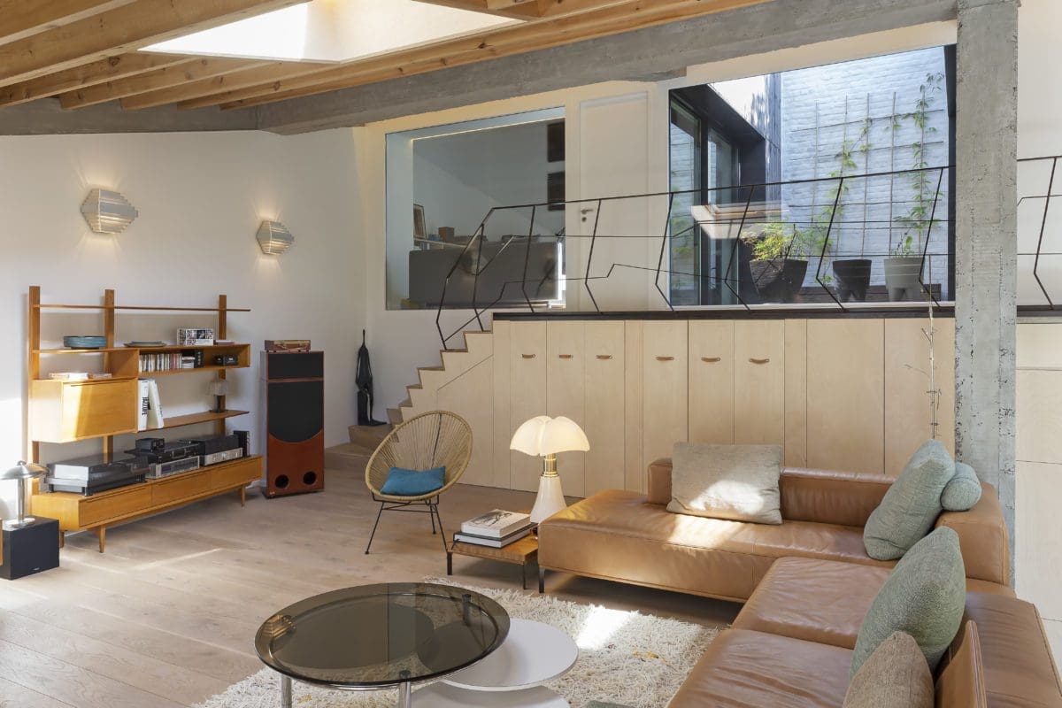 Elle est designer textile, il est passionné de musique ; tous deux aiment les lieux et les quartiers atypiques. Ce couple très artiste, parents de trois enfants, cherchait à s’installer dans un quartier bruxellois qui bouge. C’est le cas de Forest : entre la place Albert et le Forest National, salle de concert, ça swingue, avec en prime la végétation du parc alentour, les belles maisons Art déco qui s’alignent non loin des usines, dont celle de Volkswagen, des ateliers d’artisans et des entrepôts. La famille a trouvé une demeure donnant sur la rue dans un secteur très urbanisé. Quelque temps après, elle a repéré derrière chez elle un grand bâtiment qui semblait abandonné, graffité, fermé, enclavé dans une zone pavillonnaire. La surface les a interpellés, ainsi que la proximité avec leur domicile. Quelques recherches, quelques démarches et le lieu, pour le coup très atypique, de 210 m2, est devenu leur. Leur intention ? Le transformer en annexe, indépendante de leur habitation principale, mais pouvant, outre des chambres supplémentaires, abriter un salon de musique pour monsieur, un studio de création pour madame, et des espaces tranquilles pour tous. Connaissant l’inclinaison du cabinet oPla Architecture pour la restauration des bâtiments les plus improbables, les nouveaux acquéreurs sont entrés en relation avec ses fondateurs. « Lorsque nous avons découvert cette grande bâtisse dotée d’une seule ouverture mais d’une vertigineuse hauteur sous plafond, raconte Pedro Monteiro de Sousa, l’un des trois associés, nous avons tout à la fois mesuré son potentiel et les contraintes : la plus grande étant de l’éclairer le plus possible, trois façades étant aveugles. Et d’imaginer que ce lieu brut avec, entre autres, sa fosse de vidange de garagiste, devienne un cocon chaleureux. »