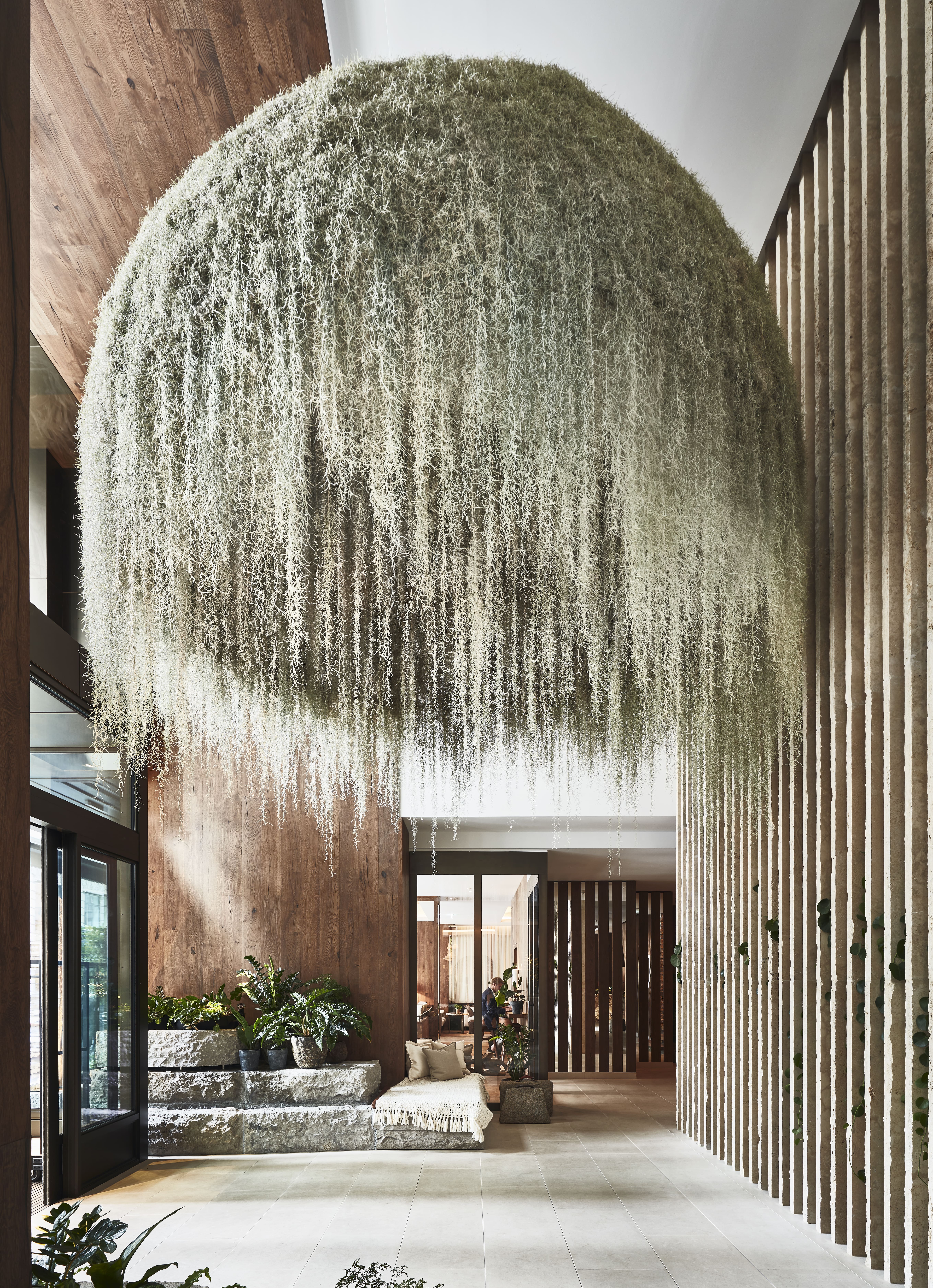 Architecte et designer, Patrick Nadeau qualifie son travail de « design végétal ». Une approche singulière qui a séduit le groupe d’établissements de luxe 1 Hotels. Son dernier-né, dans le quartier londonien de Mayfair, met en scène dans son entrée un lustre végétalisé vivant, signé Studio Patrick Nadeau. Baptisée « Rainforest », cette coupole de 4 mètres de diamètre a été recouverte à la main de plus de 50 000 brins de Tillandsia usneoides. Couramment appelée mousse espagnole, cette plante épiphyte qui s’accroche aux arbres des forêts tropicales d’Amérique centrale se nourrit exclusivement de l’humidité de l’air et de lumière. Éclairé de fibres optiques, ce lustre hors norme offre à l’hôtel une dimension onirique.