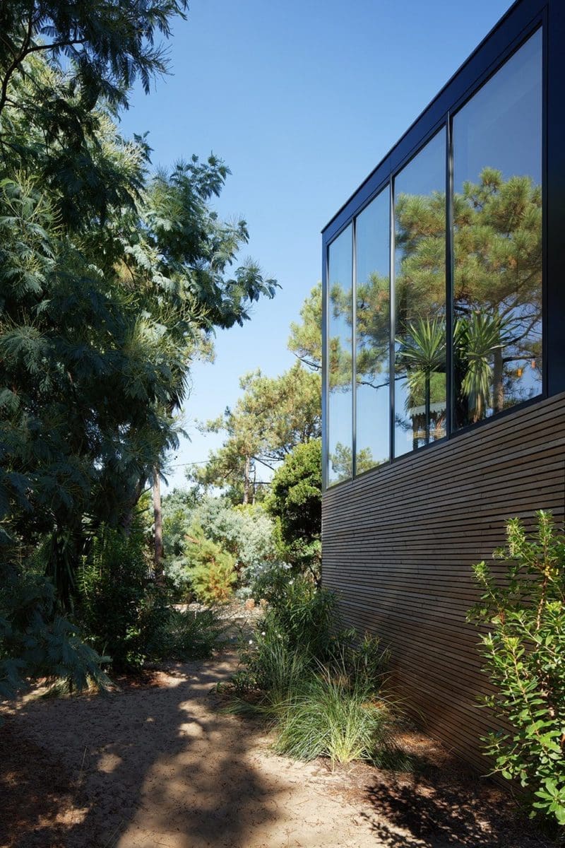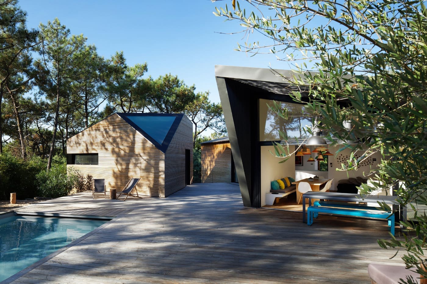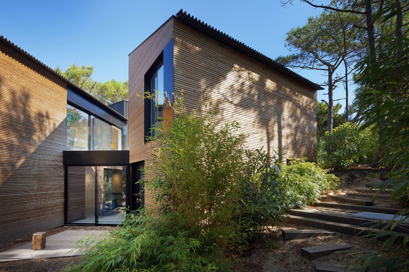 Avec ses façades revêtues de bois, la maison semble tapie dans la pinède.