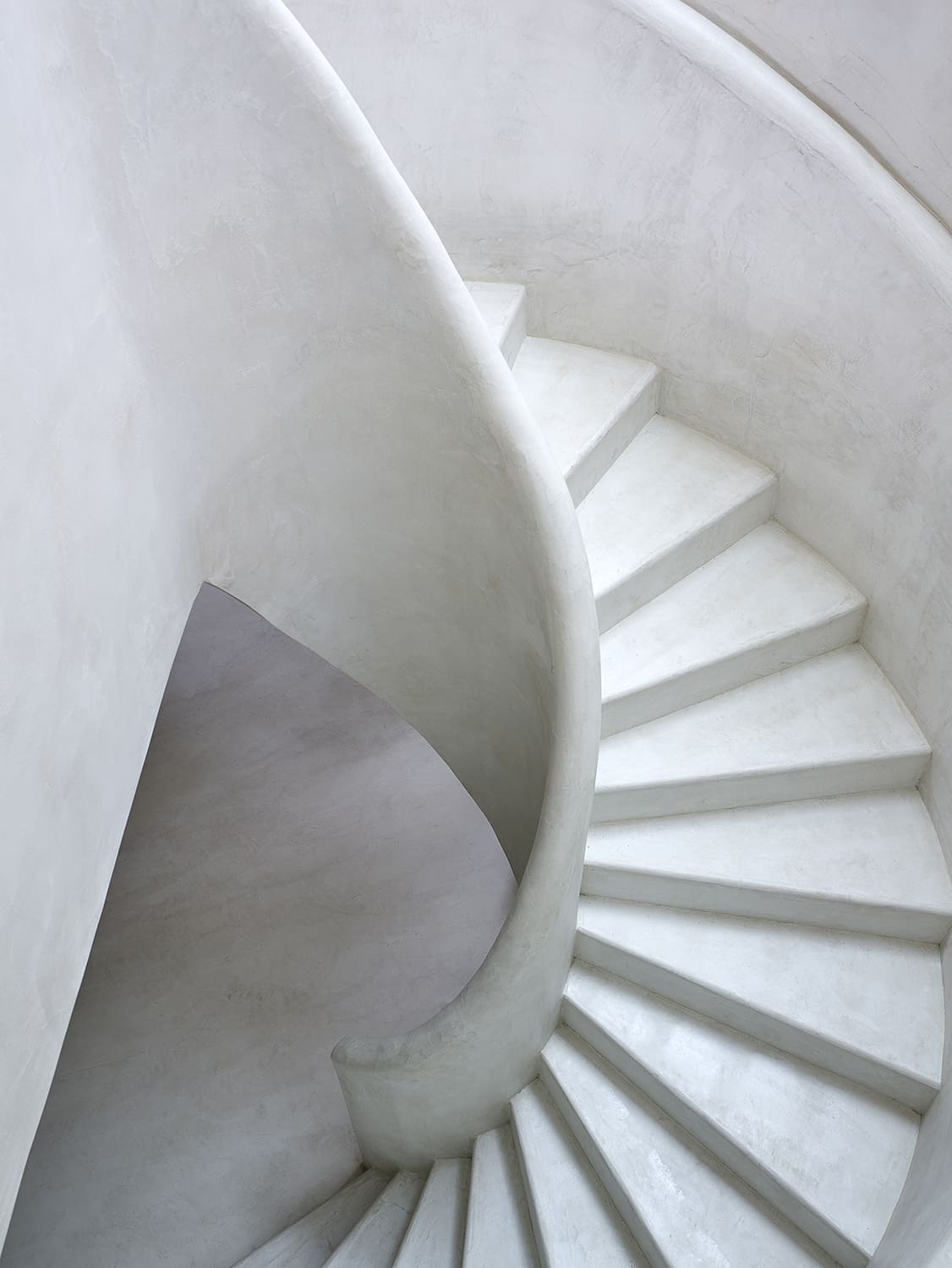 Le grand escalier intérieur maçonné, aux amples lignes courbes, adoucit les verrières triangulaires qui cadrent les vues sur la nature.