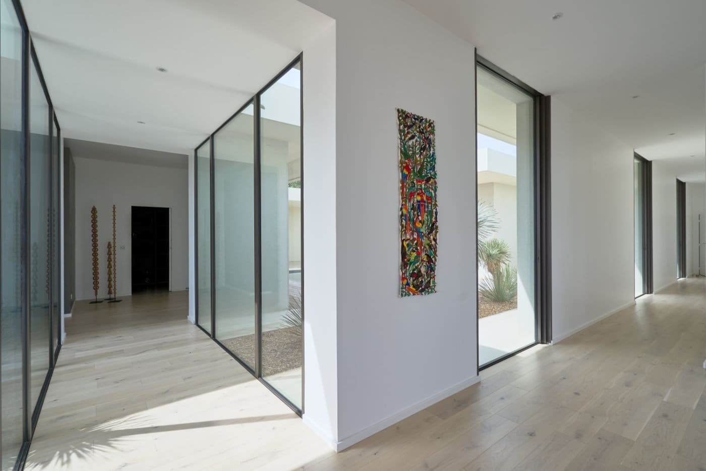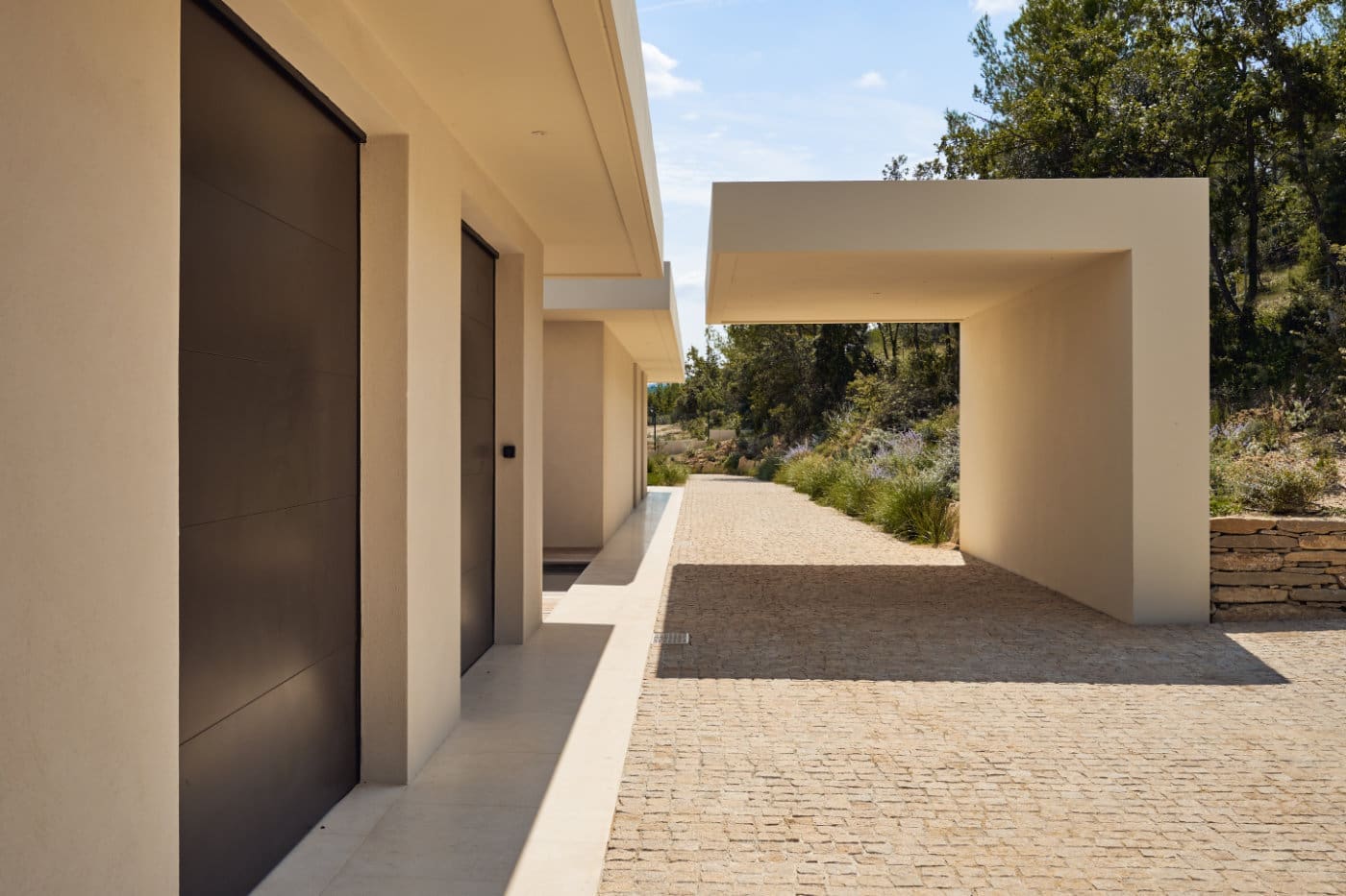 La séquence d’entrée se fait autour d’un bassin. La MaisonP n’est pas un monolithe mais une composition architecturale, structurée autour d’espaces vides, comme une référence à l’architecture bioclimatique provençale.