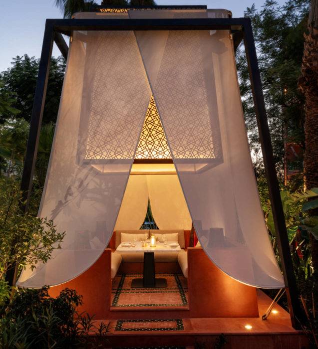 Deux tentes invitaient à flâner, lire, déjeuner, en comité restreint. La troisième cachait en ses entrailles une œnothèque et une cave surmontées d’un spectaculaire lustre de corde. « Pour écrire ce chapitre de La Mamounia, confira Patrick Jouin, je me suis répété ces mots de Giuseppe Tomasi di Lampedusa dans Le Guépard : Il faut que tout change pour que rien ne change. »