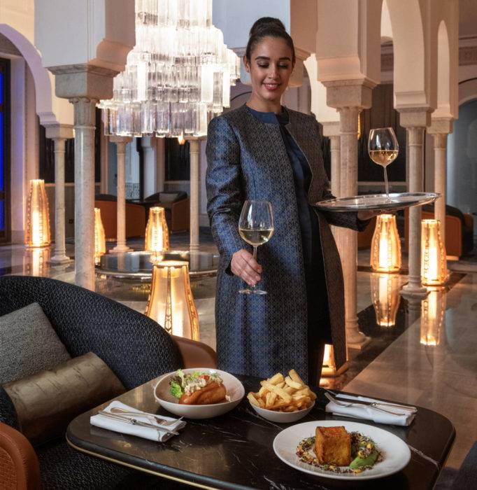 Avant de gagner, autre nouveauté, le cinéma aux vingt fauteuils bleu nuit, jouxtant le Churchill, pour visionner un documentaire sur le visage rajeuni tout en rondeurs sensuelles de la Mamounia, Sanjit Manku assurant alors : « Nous pouvons construire des lieux scintillants, glamour, puissants mais sans aucune pointe d’agressivité. Du coup, il n’y a jamais beaucoup d’angles.» Et Jouin de renchérir : « Les angles droits, ce n’est pas forcément nous ! »