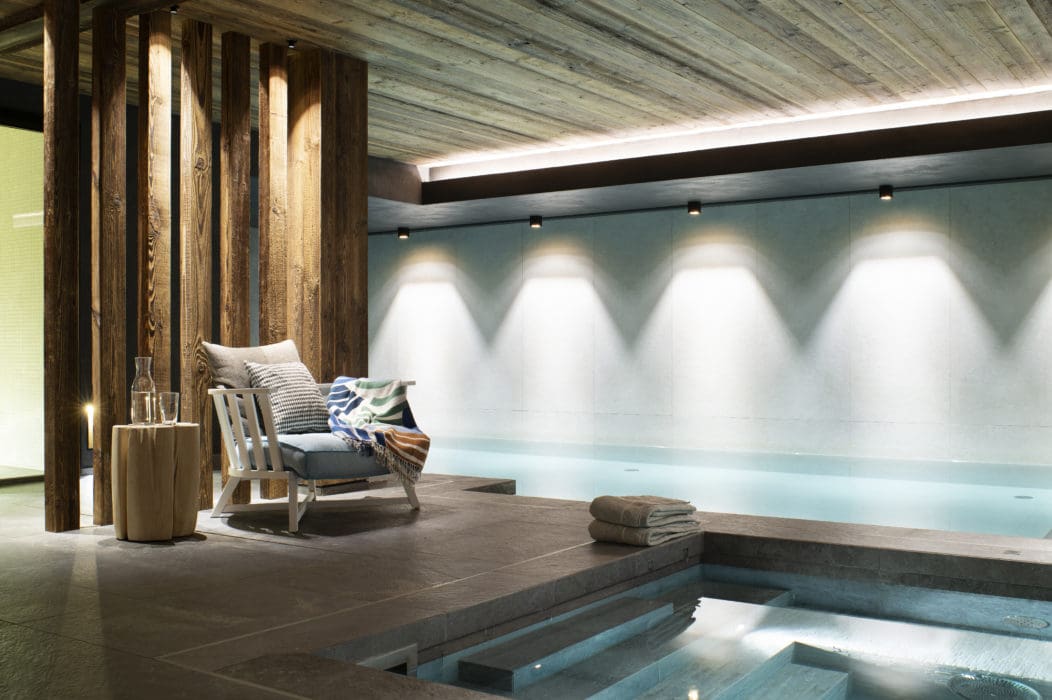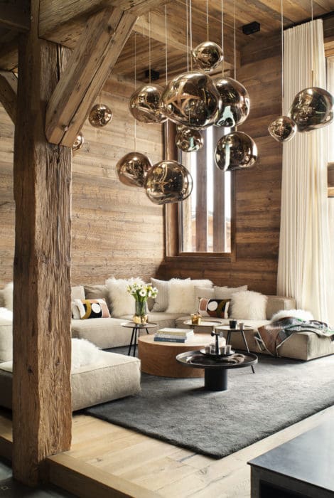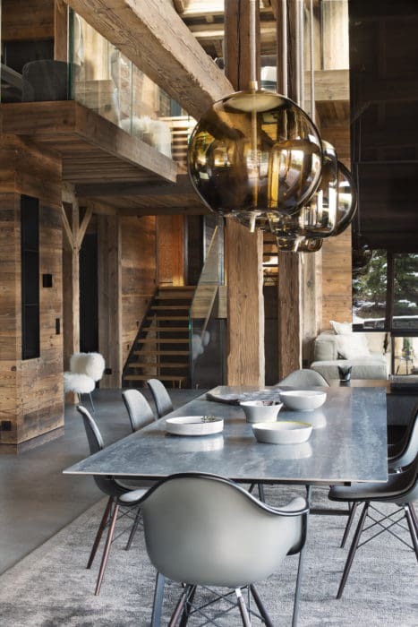 Construit en béton et isolants, il a été habillé de bois d’épicéa et de sapin de récupération, soulignés par un soubassement en pierres sèches du pays ; à l’intérieur, les espaces de vie ont été pensés pour se retrouver en famille ou entre amis, et sept chambres se composent comme des suites, avec chacune leur propre salle de bains. C’est Géraldine Marin-Prétot qui a conçu l’aménagement, la décoration intérieure, et a suivi attentivement le chantier : « Il y avait une vraie volonté de créer des zones où tous les occupants puissent être ensemble sans se gêner, de façon à ce que cette bâtisse soit intime malgré ses grands volumes. Nous avons travaillé deux ans en amont : ensuite, il ne nous a fallu que sept mois pour parvenir au résultat final », explique-t-elle. Cette experte en chalets a finalisé chaque recoin dans les moindres détails. Dans les parties communes, elle a créé des petits salons, pour permettre aux hôtes de s’isoler, tandis qu’un jeu de huit demi-niveaux garantit une circulation facile.