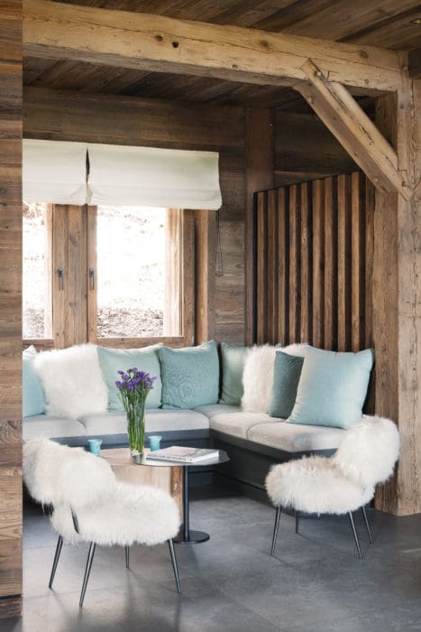 Construire au sein de ce site préservé une ferme neuve qui semble avoir toujours été là, voilà le plus grand défi qu’a dû relever le propriétaire de la société Otoctone, spécialisée dans la location d’adresses de luxe sises dans des cadres hors du commun. Ce projet ambitieux a nécessité un travail à plusieurs mains, qui a mobilisé le cabinet d’architectes et les maîtres d’œuvre Chatron-Michaud à Combloux, mais aussi les architectes d’intérieur Damien Carreres, de Lyon, et Géraldine Marin-Prétot, installée à Megève. Résultat, le bâtiment, s’il impressionne à première vue par ses dimensions – contraint par la typologie du terrain et le plan d’urbanisme, il se déploie tout en longueur sur 800 m2 –, reprend sans fausse note l’esthétique des fermes typiques de la région en pierres et en bois, avec sa toiture à deux pentes et ses volumes « écrasés ».