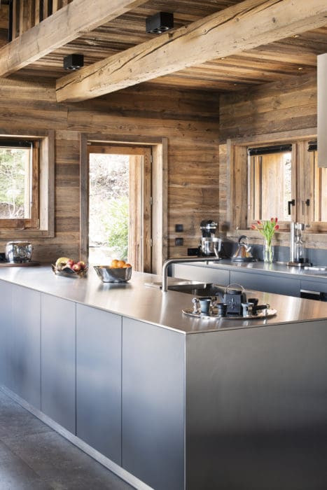 Amoureuse de la montagne, elle en a distillé avec esprit les codes esthétiques : un sol minéral en dalles de grès cérame gris au rez-de-chaussée, de grandes planches et des vasques en céramique dans les salles de bains, et surtout du bois, brut, authentique, partout, dont l’odeur rassérénante imprègne le décor. Ces choix qui ancrent visuellement la demeure dans son environnement sont savamment contrebalancés par des notes contemporaines. Ainsi, autour de la cheminée où crépitent les flammes, un salon blanc en estrade prend des allures de club. La cuisine est spacieuse, conçue dans un esprit professionnel, avec ses plans de travail en Inox fin. Décloisonnée, baignée de lumière, la salle à manger a été prévue pour accueillir de belles tablées festives. Quant à l’escalier aux parois de verre ultra-moderne, il dessert l’espace jeux et les chambres. Au sein de ces dernières, très spacieuses, un mur en enduit au dos du lit reflète la lumière, et permet de contourner l’écueil du total look bois, auquel succombent cependant avec bonheur les pièces d’eau, d’où l’on tutoie la nature engourdie dans la poudreuse.