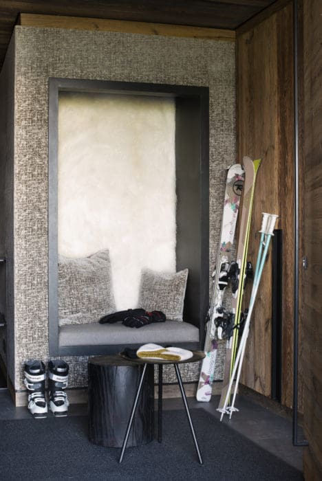 dalles grises en grès cérame Kronos. Une niche accueillante tendue de tissu Nobilis reprend l’idée d’une cabine de téléphérique. Guéridon Polspotten ; tabouret en cèdre brûlé Riva 1920 ; tapis Limited Edition.